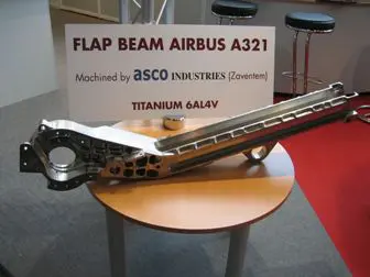 Een titanium 6Al4V onderdeel voor de Airbus A321 bewerkt door Asco. Dit deel is geëxposeerd tijdens de EMO Hannover 2007 (foto: Reinold Tomberg)