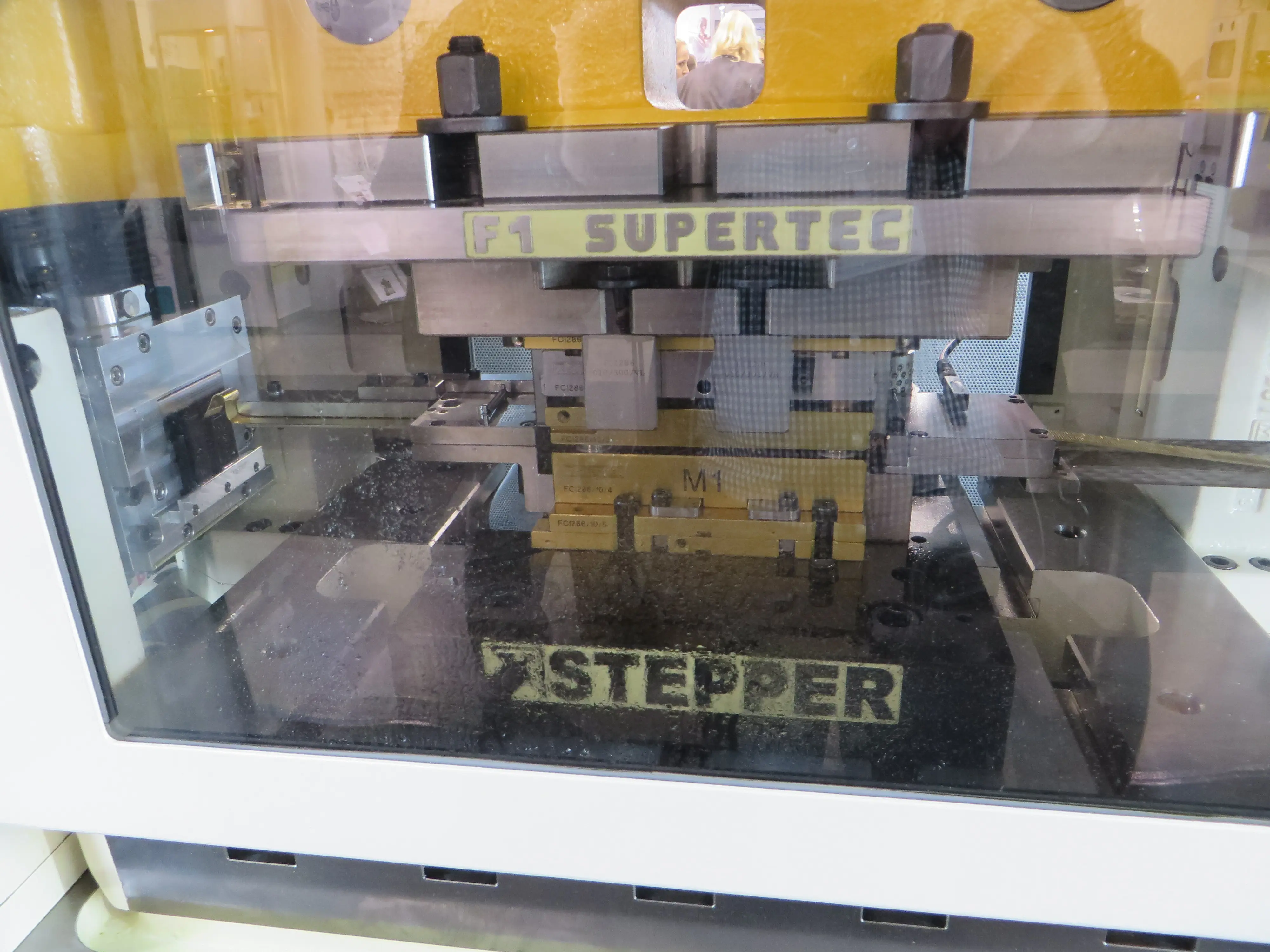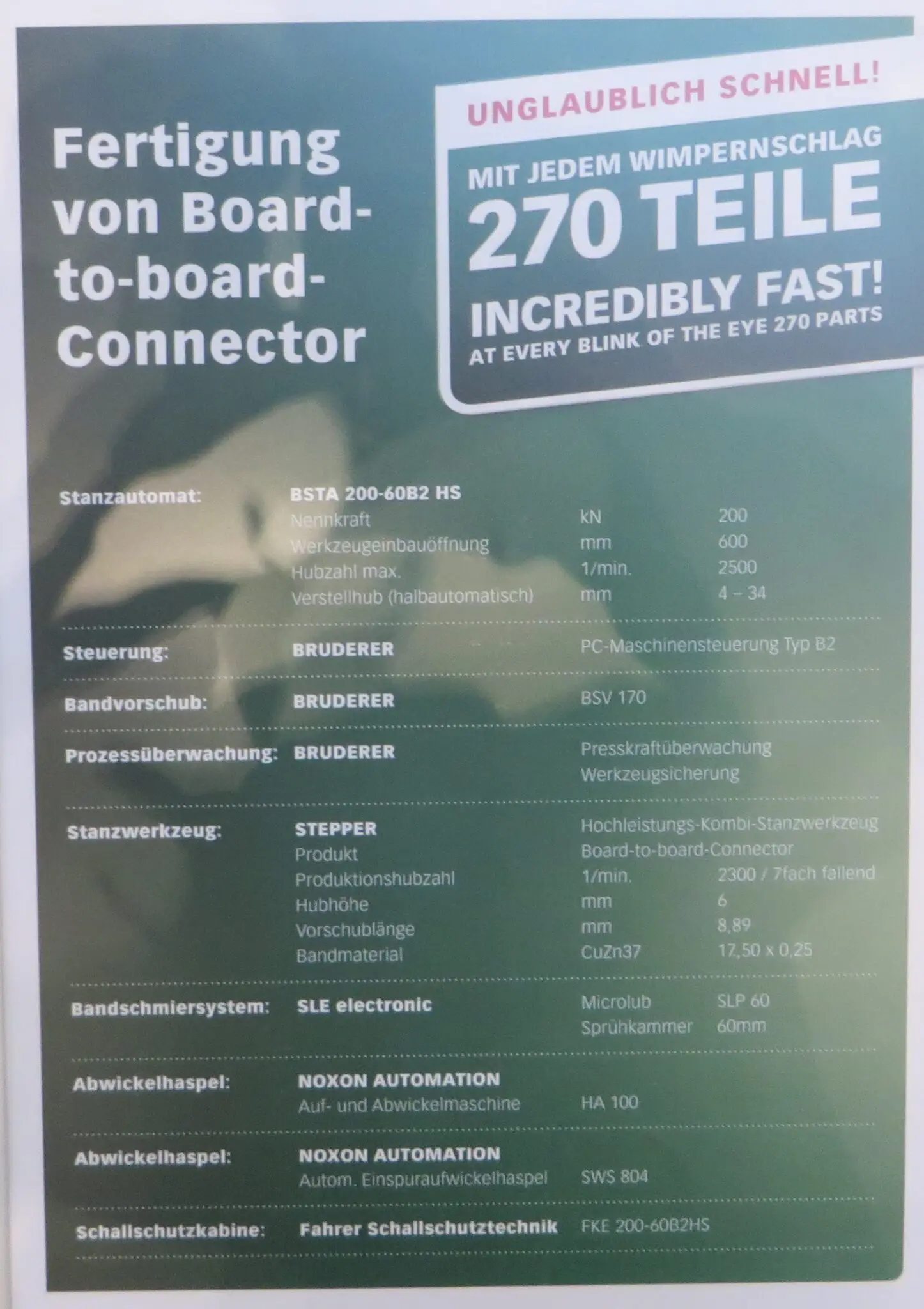 De onderste foto bij dit bericht (onze verontschuldigingen voor de reflecties) geeft meer technische informatie van de snelloopdemonstratie. De betreffende pers, een BST 200-60B2 HS van Bruderer kan maximaal 2.500 slagen per minuut halen.