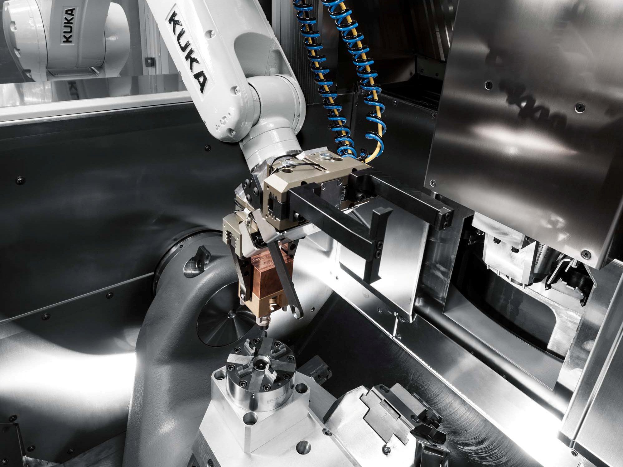 Hermle heeft de compacte C 12 U dynamic uitgevoerd met een RS 05 robotsysteem. Het robotsysteem vergroot hiermee het vloeroppervlak met slechts 2 m2. Vooral in sectoren als de medische technologie, precisie-engineering en de gereedschap- en matrijzenbouw komt de C 12 U met het 05 RS robotsysteem tot zijn recht.