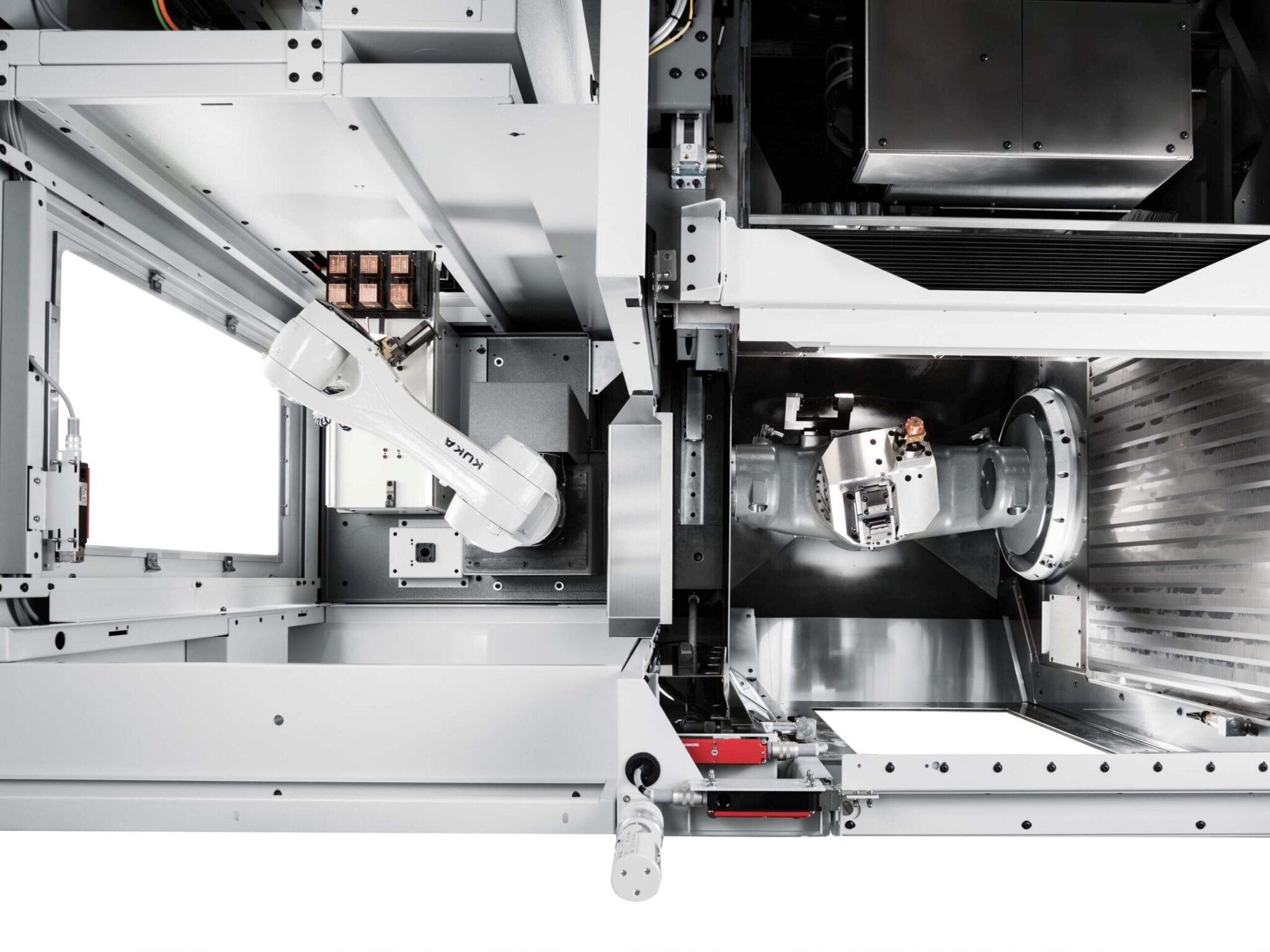 De volledig geautomatiseerde productielijn stelt de gebruiker in staat om rond de klok en manloos te produceren. De RS 05 wordt aan de linkerzijde van de C 12 U geïnstalleerd en is voorzien van twaalf compartimenten die in hoogte verstelbaar zijn. De compartimenten kunnen worden gevuld met werkstukken of pallets. De robot kan werkstukken of pallets met een massa tot 8 kg direct in de bewerkingsruimte van de Hermle C 12 plaatsen. Hiervoor verplaatst de Y-as van het bewerkingscentrum in de gereedschapwisselpositie en opent gelijktijdig de deur tussen de bewerkingsruimte en de robot. De belading van de twaalf compartimenten gaat vanaf de achterzijde van het robotsysteem.