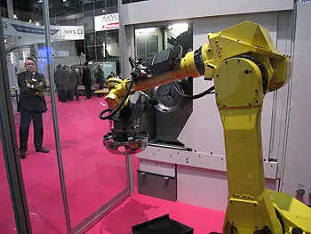 De industriële robot Fanuc 21iT stond in Düsseldorf naast de MHC draaibank van Monforts opgesteld (foto’s: Reinold Tomberg)