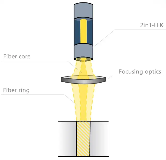 Een TruDisk-schijflaser koppelt het laserlicht in de LLK en verdeelt het laservermogen over de binnenste kern en de buitenste ring met behulp van een wedge switch (spiewissel).
